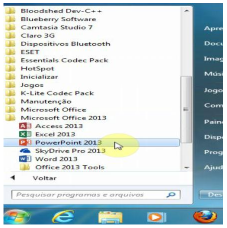 Para abrir o programa Word 2013, clique no botão Iniciar, posicione o mouse sobre a opção Todos os Programas, clique em Microsoft Office 2013 e selecione Word 2013.