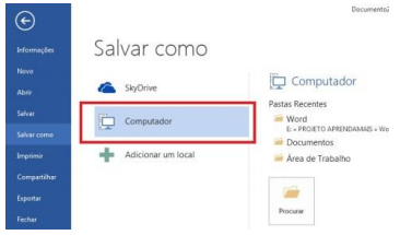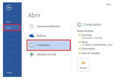 Com o Word 2013 aberto, clique na guia Arquivo e selecione a opção Abrir e em seguida clique duas vezes em Computador.