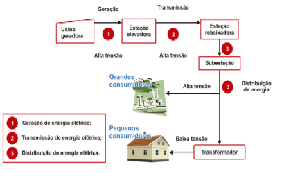 No Brasil, 80% da eletricidade é proveniente de usinas hidrelétricas, 11% de usinas termelétricas e o restante de outros processos. A energia da fábrica é convertida na subestação e elevada ao nível de tensão (69/88/138/240/440 kV) e transmitir via cabos com corrente alternada (60 Hz) para a subestação descendente, definindo assim a fase de transmissão.