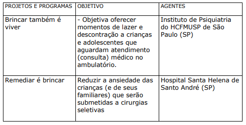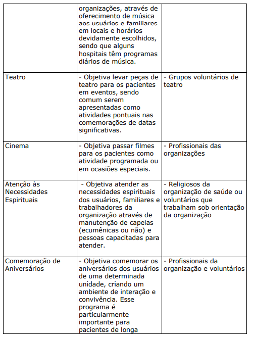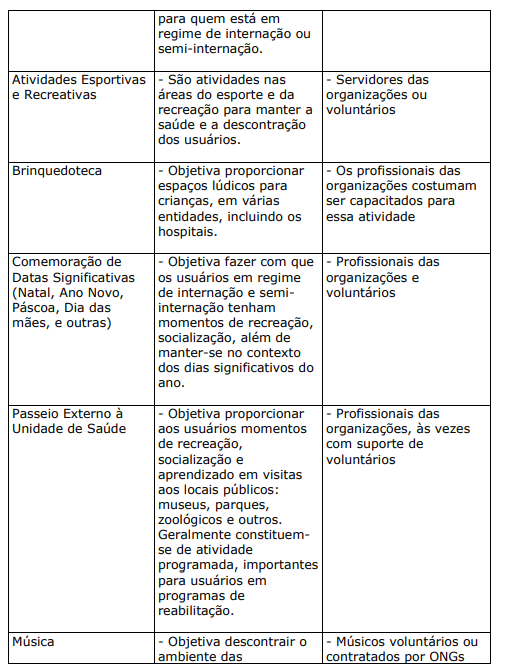 Trata-se de projetos ou programas solicitados pelas organizações de saúde com o objetivo de lazer, descontração, educação e socialização do usuário e seus familiares. Costumam ser desenvolvidos por entidades parceiras das organizações, geralmente organizações do terceiro setor. Algumas vezes, os profissionais das próprias organizações de saúde também colaboram no desenvolvimento das atividades.