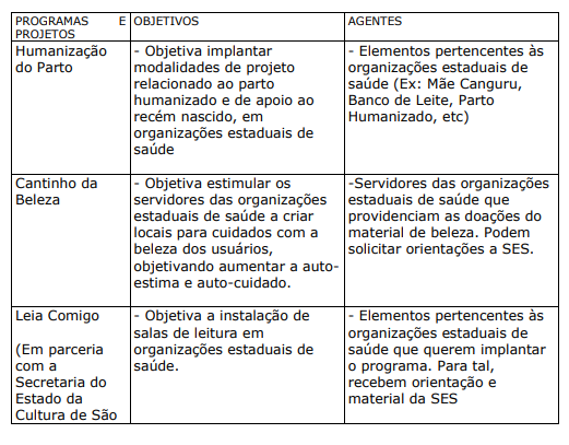 b) PROJETOS E PROGRAMAS DESENVOLVIDOS OU APOIADOS PELA SECRETARIA DO ESTADO DA SAÚDE DE SÃO PAULO