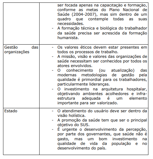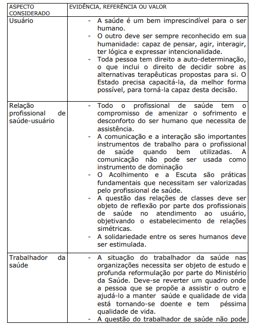 Finalizando, é importante resumir em um quadro algumas evidências, referências e valores importantes para efetivar a humanização do sistema de saúde do Brasil.