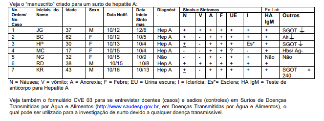 - Informações sobre fatores de risco/fontes de transmissão: o levantamento de fatores de risco, fontes de transmissão são fundamentais para a investigação da doença em questão. Por exemplo: em uma investigação de surto por hepatite A, perguntamos sobre exposições a alimentos ou a água contaminada ou contato anterior com outro caso. As informações podem ser coletadas em formulário que permita visualizar em cada linha os dados dos pacientes, o que permite ao investigador buscar facilmente essas informações. Novos casos vão sendo acrescentados à medida que são identificados. No mundo inteiro, mesmo na era dos computadores, os epidemiologistas ainda utilizam esse “manuscrito” para coletar e avaliar os dados. Tais dados aí coletados, inseridos no computador, permitem fazer vários cruzamentos e compreender melhor o surto.