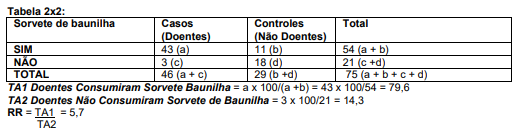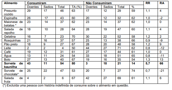 O item sorvete de baunilha foi o veículo ou fonte implicada. O risco relativo (RR) foi 80/14, isto é, 5,7. Este RR indica que pessoas que comeram sorvete de baunilha tinham 5,7 vezes mais chance (probabilidade) de ficar doente do que aquelas que não comeram sorvete de baunilha.