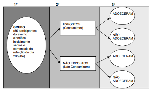 No dia 20 de setembro de 2004, foi realizado um evento científico em um auditório de uma escola, no município de São Paulo, com 65 pessoas procedentes de várias regiões do Estado de São Paulo. Às 12h00 serviu-se uma refeição para 55 participantes deste evento (GRUPO). Os 10 demais participantes preferiram almoçar em restaurantes da redondeza e, portanto, não compartilharam da refeição oferecida no evento. A refeição (EXPOSIÇÃO/FATOR DE RISCO COMUM), preparada por bufê, foi composta por três tipos de sanduíches, de tamanho pequeno: 1) queijo branco, tomate seco, maionese e alface; 2) salame, queijo cheddar, maionese e alface; e, 3) peito de peru, queijo mussarela, maionese e alface; 4) sucos de caju e tangerina, 5) refrigerantes diversos, 6) salada de frutas e 7) bolo simples. No segundo dia do evento, várias pessoas faltaram, pois estavam com diarreia líquida ou pastosa, cefaleia intensa, náusea, mal-estar, febre de 39º C, dor abdominal, artralgia e mialgia, anorexia e vômito, necessitando de atendimento médico. Observou-se que todas as pessoas que não almoçaram no evento, no primeiro dia, não apresentaram sintomas. Amostras coletadas de seis doentes foram positivas para S. Typhimurium.