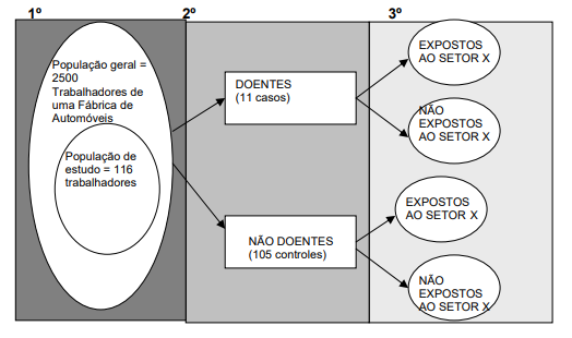 Estudo de caso-controle é a denominação dada a um tipo de investigação ou pesquisa em que se escolhem, ou melhor, recrutam-se pessoas que têm uma determinada doença que se pretende investigar realizando-se comparações com pessoas escolhidas, recrutadas, que não têm a doença. As pessoas com a doença são chamadas de “caso” e as sem a doença, de “controles”. Nessas comparações, perguntas sobre os fatores de risco/exposições compatíveis com o agente etiológico e o modo de transmissão da doença em investigação, são feitas aos dois subgrupos, buscando-se identificar a causa. Parte-se do doente para esclarecer a associação - exposição e doença. Cada um desses dois subgrupos de pessoas recrutadas, doentes e sadias, é classificado, por sua vez, em mais dois subgrupos segundo a exposição ou não a um determinado fator de risco (expostos e não-expostos), causa potencial de uma determinada doença ou efeito nocivo à saúde sob investigação. No estudo de caso-controle interessa conhecer: 1) quais dos doentes se expuseram ao fator de risco “x” e quais não se expuseram; 2) quais dos sadios se expuseram ao fator de risco “x” e quais não se expuseram.
