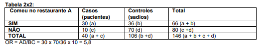 É uma razão de prevalências onde se compara a proporção de expostos entre os casos com a proporção de expostos entre os controles. Para entender melhor devemos utilizar a Tabela 2x2. Por exemplo, supondo que se esteja investigando um surto de hepatite A em uma pequena cidade, e a suspeita mais forte recaiu sobre um restaurante famoso da cidade. Depois de entrevistar os pacientes (casos) e os sadios (controles) sobre se frequentavam o restaurante, analise os resultados os dados em Tabela 2x2: