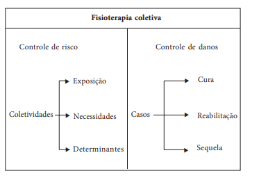 Enquanto a fisioterapia reabilitadora concentra sua atuação, quase que exclusivamente, no controle de danos, seja buscando a cura de determinadas doenças que restringem a locomoção humana, seja reabilitando sequelados de patologias diversas ou desenvolvendo a capacidade residual funcional de indivíduos que tiveram lesões irreparáveis de determinadas funções, a fisioterapia coletiva possibilita e incentiva a atuação também no controle de risco, ou seja, no controle de fatores que potencialmente podem contribuir para o desenvolvimento da doença.