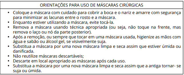 Tabela 02 - Orientações para uso correto de máscaras cirúrgicas para evitar contágio por vírus causadores de Síndromes Gripais, Ministério da Saúde, 2020.