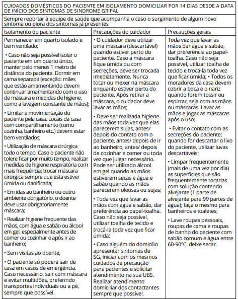 Pacientes com diagnóstico de Síndrome Gripal (SG) sem sinais de gravidade deverão realizar isolamento domiciliar, por 14 dias desde a data de início dos sintomas, conforme indicado pelo médico ou enfermeiro, seguindo as recomendações para cuidados domésticos descritas na tabela 04. Os contatos domiciliares de paciente com SG confirmada também deverão realizar isolamento domiciliar por 14 dias, conforme orientação do médico e/ou enfermeiro seguindo as condutas descritas na tabela 04 - Precauções do cuidador.