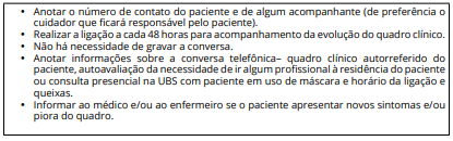 O ACS deve reforçar as orientações aos pacientes em isolamento e aos seus cuidadores, assim como, auxiliar a equipe no monitoramento dos pacientes a cada 48 horas, até 14 dias após o início dos sintomas, preferencialmente por telefone, informando ao enfermeiro ou médico de forma imediata caso o paciente refira agravamento dos sintomas ou mudança das condições clínicas (como sintomas novos).