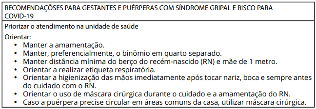 Gestantes e puérperas:Até onde as evidências atuais indicam, gestantes e puérperas não possuem risco individual aumentado para o novo coronavírus. Contudo medidas devem ser adotadas para proteção da criança. Além disso, gestantes e puérperas têm maior potencial de risco para desenvolvimento de Síndrome Respiratória Aguda Grave - SRAG por Síndrome Gripal decorrente do vírus da Influenza. Desta forma, importante seguir as recomendações expressas na Tabela 6.