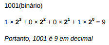 Dado um número N, binário, para expressá-lo em decimal, deve-se escrever cada número que o compõe (bit), multiplicado pela base do sistema (base = 2), elevado à posição que ocupa. Exemplo: