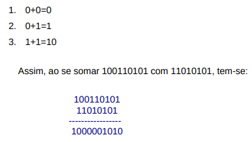 Opera-se como em decimal: começa-se a somar desde a esquerda, no exemplo, 1+1=10, então se escreve 0 e "leva-se" 1. Soma-se este 1 à coluna seguinte: 1+0+0=1, e segue-se até terminar todas as colunas (exatamente como em decimal).