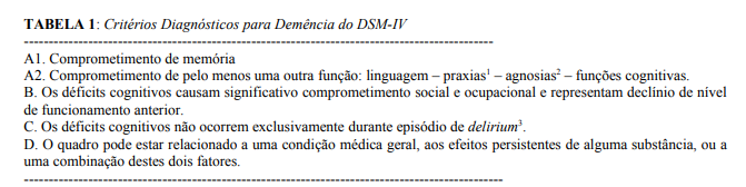 Os autores ressaltam algumas limitações quanto ao diagnóstico, pois este exige a constatação da deterioração intelectual em relação à condição prévia do indivíduo e normalmente não existem dados que permitam a avaliação pregressa em comparação com os exames atuais. Dessa forma, consideram o levantamento da história clínica e a constatação da interferência nas atividades profissionais e sociais do indivíduo como fundamentais para a suspeição diagnóstica. Sugerem os critérios estabelecidos pelo Manual de Diagnóstico e Estatística de Transtornos Mentais – 4. ed (DSM-IV), como os mais empregados para o estabelecimento do diagnóstico da demência. Esses critérios encontram-se na tabela abaixo: