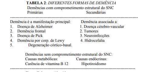 Conforme dados apresentados na tabela 2 (Ibidem, p. 110), constata-se que a diferenciação das demências é avaliada na medida em que acometem ou não a estrutura do sistema nervoso central. As demências primárias e as secundárias são as que apresentam comprometimento do sistema nervoso central. Entre as primárias, há aquelas em que a demência é a manifestação clínica principal, (Doença de Alzheimer, Doença de Pick e a demência por inclusão de corpúsculos de Lewy). Entre as demências secundárias, encontram-se, com mais freqüência, as demências vasculares, as de etiologia infecciosa, tumores e hidrocefalia. As demências que se apresentam sem o comprometimento do sistema nervoso central, incluem demências de etiologia metabólica, (carência de vitamina B12) e endócrina (hipotireoidismo).
