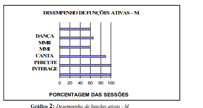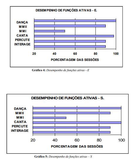 O Gráfico 5 demonstra as ações ativas de S., que interagiu socialmente e percutiu em 85% das sessões. Cantou em 100% delas. Realizou movimentos de membros superiores em 85% das sessões. Dançou em 100% dos encontros terapêuticos.