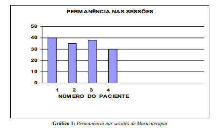 Os dados do Gráfico 1 referem-se à permanência dos pacientes no desenvolvimento das atividades propostas nas sessões. Num total de quarenta sessões, o paciente 1 permaneceu em 100% das sessões. O paciente 2 permaneceu em 80% das sessões. O paciente 3 compareceu em cerca de 80% dos encontros e o paciente 4 em 75%. Os dados revelam uma taxa alta de permanência, o que demonstra, considerando-se o perfil dos pacientes portadores da Doença de Alzheimer, interesse pelas atividades musicoterapêuticas.