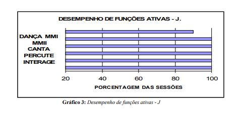 O gráfico de suas ações ativas demonstra que trocou experiências, diminuindo o grau de isolamento e solidão em que normalmente permanecia. Suas reações confirmam Shreeve (1996) quando esse autor comenta que a música preenche um essencial e primitivo objetivo biológico: despertar o cérebro para um estado de prontidão no qual ficamos mais capacitados para lidar com o meio que nos cerca.