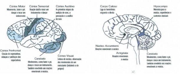 A exposição musical gera alterações fisiológicas que vão de modulação neurovegetativa nos ritmos endógenos da frequência cardíaca, ritmos respiratórios, ritmos elétricos cerebrais, ciclos circadianos de sono-vigília, até a produção de vários neurotransmissores responsáveis pela recompensa, prazer e dor. As exposições prolongadas à música são prazerosas, fazendo aumentar a produção de neurotrofinas produzidas pelo sistema nervoso em situações de desafio, pode não só determinar aumento da sobrevivência de neurônios como mudanças de padrões de conectividade na chamada neuroplastícidade (Figura 4).