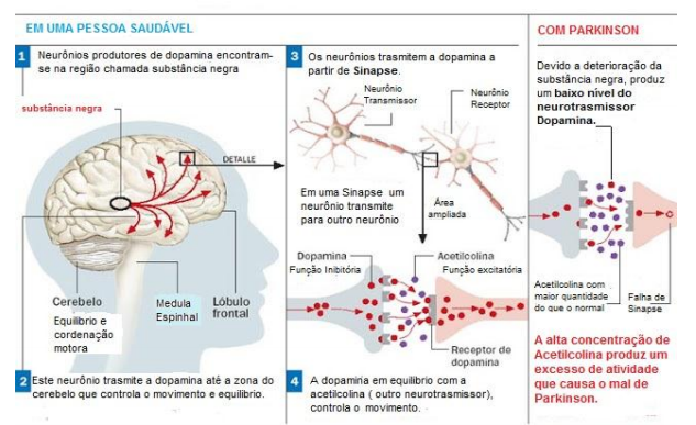 FIGURA 3- Ação da dopamina no sistema nervoso e como origina a doença de Parkinson