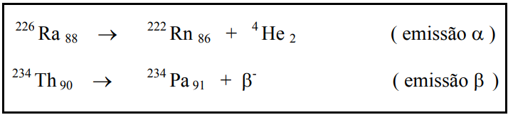 Quando um núcleo é instável por excesso de núcleons (prótons e nêutrons) ou quando a razão A/Z (número de massa/número atômico) é muito grande, ele se desintegra, por emissão alfa ou beta, conforme exemplificado a seguir: