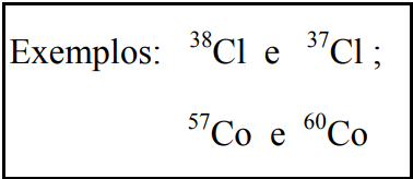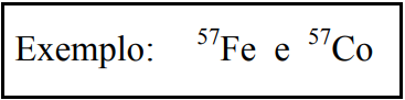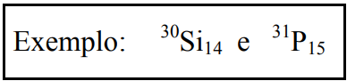 São nuclídeos que possuem o mesmo número de massa e diferentes números atômicos. Tendo números atômicos distintos, comportam-se quimicamente de forma diferente.