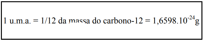 Como a massa dos elétrons que orbitam em torno do núcleo é muito pequena, é correto considerar o núcleo como um ponto minúsculo no centro do átomo onde está concentrada a maior parte de sua massa. O átomo de um elemento possui uma massa bem definida, cujo valor exato é determinado em relação à massa de um elemento tomado como padrão. Em 1961, por um acordo internacional entre físicos e químicos, foi estabelecida uma escala unificada, tendo sido atribuído o valor exato de 12,000000 para a massa atômica do carbono-12, Assim, nessa escala, uma unidade de massa atômica é igual a 1/12 da massa do átomo de carbono-12, ou seja: