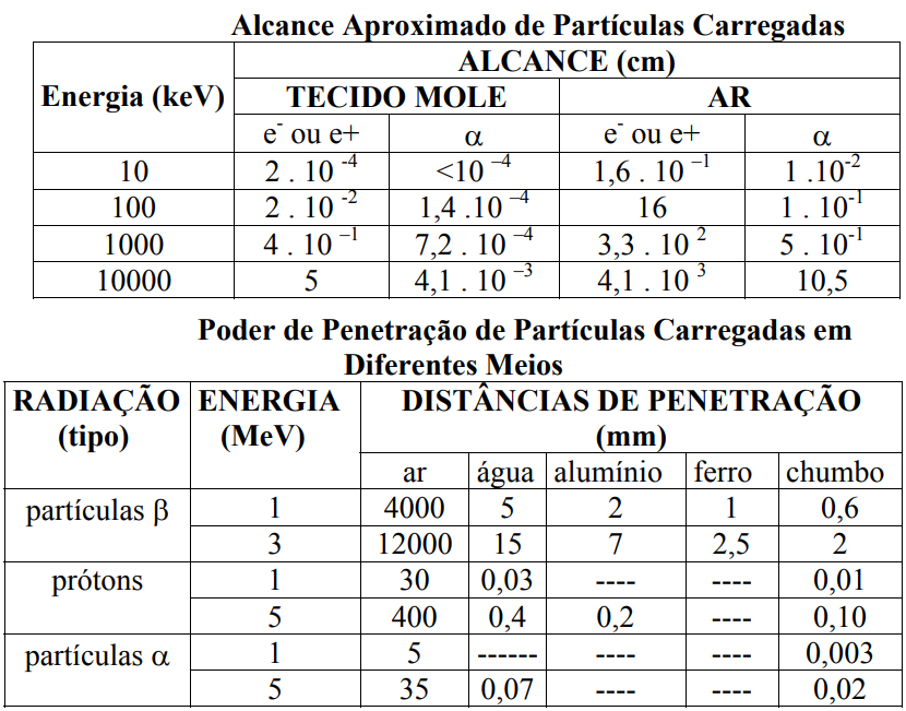 - Densidade do Meio: Quanto mais alta a densidade do meio, menor é o alcance da partícula, sendo este muito maior em gases do que em líquidos ou sólidos.