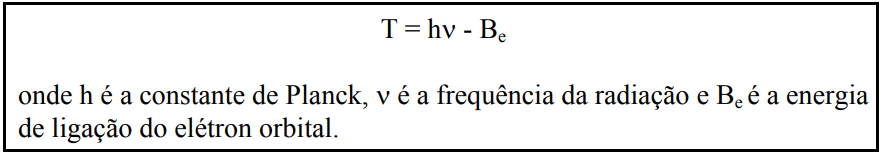 Efeito Fotoelétrico: caracterizado pela transferência total de energia de um fóton (radiação X ou gama), que desaparece, a um único elétron orbital, o qual é expelido com uma energia cinética bem definida, T, qual seja: