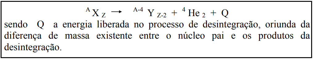 As partículas alfa são núcleos de hélio, constituídos por dois prótons e dois nêutrons, tendo duas cargas positivas. A reação de desintegração alfa pode ser assim esquematizada:
