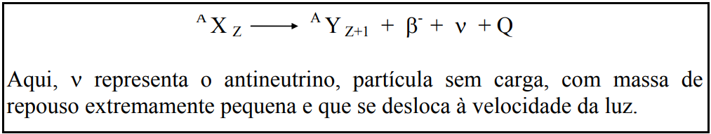 A partícula beta negativa possui as mesmas características dos elétrons atômicos, porém tem origem no núcleo. A emissão de partícula β- é diferente das emissões α uma vez que as partículas β- são emitidas em um espectro contínuo de energia, variando de zero até um valor máximo, característico do núcleo pai. Esta energia máxima está na faixa de 0,05 - 3,5 MeV, para os nuclídeos mais comuns. Como o núcleo possui níveis de energias discretos, a emissão de uma partícula com espectro contínuo de energia é explicada pela emissão de uma segunda partícula, neste caso o antineutrino. O antineutrino transporta a diferença de energia existente entre a energia da partícula beta negativa e a energia disponível, dada pela diferença de massa entre o núcleo pai e os produtos da desintegração (Q).