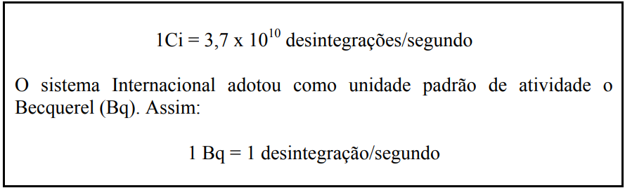 A primeira unidade estabelecida para atividade foi o Curie, originalmente definido como a taxa de desintegração do gás radônio (222Rn), em equilíbrio com um grama de rádio (226Ra). Posteriormente, o Curie foi definido mais precisamente pelo valor abaixo, que é bem próximo do medido originalmente.