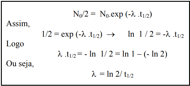 A meia-vida de um isótopo radioativo, t1/2, é o tempo necessário para que metade dos átomos contidos numa amostra desse isótopo sofra desintegração, ou seja, é o tempo necessário para que N seja igual a N0/2. A relação matemática existente entre λ e t1/2 pode ser obtida substituindo-se, na equação anterior, N por N0/2 e t por t1/2.
