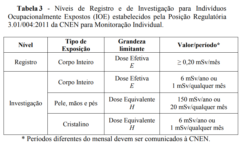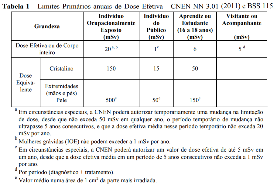 Dessa forma impõe-se que as doses individuais de Indivíduos Ocupacionalmente Expostos (IOE) e de indivíduos do público não devem exceder os limites anuais de doses estabelecidos na Tabela 1. Outra meta da proteção radiológica é a de limitar a probabilidade de ocorrência de efeitos estocásticos. A limitação de dose para efeitos estocásticos é baseada no princípio de que o detrimento deve ser igual, seja para irradiação uniforme de corpo inteiro, seja para irradiação não uniforme. Para que isso ocorra é preciso que