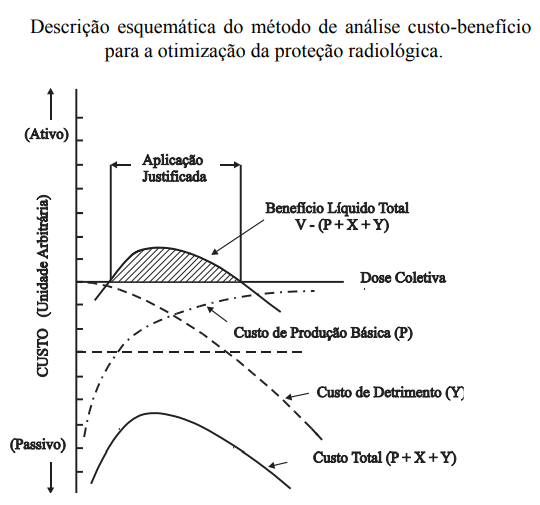 princípio ALARA estabelece, portanto, a necessidade do aumento do nível de proteção a um ponto tal que aperfeiçoamentos posteriores produziriam reduções menos significantes do que os esforços necessários. A aplicação desse princípio requer a otimização da proteção radiológica em todas as situações onde possam ser controladas por medidas de proteção, particularmente na seleção, planejamento de equipamentos, operações e sistemas de proteção. Os esforços envolvidos na proteção e o detrimento da radiação podem ser considerados em termos de custos; desta forma uma otimização em termos quantitativos pode ser realizada com base numa análise custo-benefício. Na Figura abaixo faz-se uma representação esquemática desta análise, utilizando como parâmetro a dose coletiva.