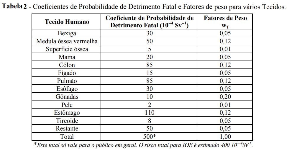O fator de peso, wT, para efeitos estocásticos no tecido T, é definido como sendo a razão entre o coeficiente de probabilidade de detrimento fatal para esse tecido (fT), levando em conta a severidade do efeito e o coeficiente de risco total para o corpo, para irradiação uniforme de corpo inteiro. Os valores de fT e wT para vários tecidos são mostrados na Tabela 2.