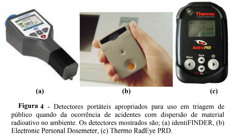 Personal Radiation Detector (PRD) Thermo RadEye, com detector de NaI(Tl) de alta sensibilidade e seletividade para radiação gama, com microfotomultiplicadora; IdentiFINDER, com detector de NaI(Tl) e GM, capaz de identificar o radionuclídeo emissor gama, conforme mostrados na Figura 4. Estes detectores medem taxa de exposição (mR/h), taxa de dose efetiva (mSv/h), contagem por segundo (cps), em ampla faixa de detecção. Eles fazem os testes operacionais e subtraem o background automaticamente, podem ser conectados a microcomputadores, e operam no modo sonoro ou vibracional. Estes detectores são apropriados para ser utilizados no sistema de segurança durante a realização dos grandes eventos, como Jogos Pan-americanos, Copa das Confederações, Copa do Mundo e Olimpíadas.