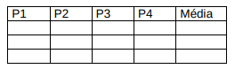 Imagine o seguinte problema: Calcular a média final dos alunos da 3ª Série. Os alunos realizarão quatro provas: P1, P2, P3 e P4.
