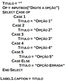Em Visual Basic utilizamos a seguinte seqüência de comandos para representar o diagrama anterior.