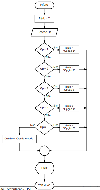 No exemplo do diagrama de blocos abaixo, é recebido uma variável “Op” e testado seu conteúdo, caso uma das condições seja satisfeita, é atribuído para a variável Titulo a String “Opção X”, caso contrário é atribuído a string “Opção Errada”.
