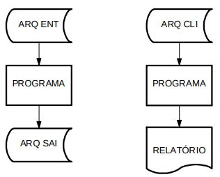 Estes dois exemplos de Macro-fluxo dão uma visão geral de como devemos proceder com cada um dos programas. O primeiro diz que haverá um arquivo de entrada, um processamento e um arquivo de saída. Já o segundo exemplo diz que haverá um arquivo de entrada, um processamento, e a saída serão um relatório.
