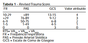 Em APH, o Revised Trauma Score (RTS) (Tabela 1) para triagem, é muito usado devido à facilidade de aplicação em cena e por permitir, além da avaliação da gravidade do trauma e triagem correta dos casos para o hospital de destino, a avaliação do status fisiológico em diferentes momentos do atendimento, desde a chegada na cena até a chegada ao hospital.