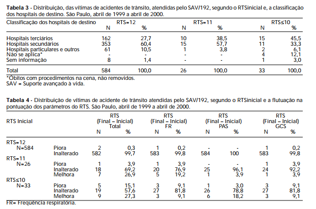 Análise de 643 registros de atendimento de SAV a acidentados de trânsito, ocorridos em vias expressas da cidade de São Paulo, SP, no período de abril/1999 a abril/2000. Os intervalos de tempo avaliados foram: tempo resposta, de cena, de transporte e total. A análise da decisão de triagem considerou os registros de RTS£11 como corretos para encaminhamento a hospitais terciários. As flutuações no RTS e parâmetros foram observadas através da equação: (RTSfinal – RTSinicial).