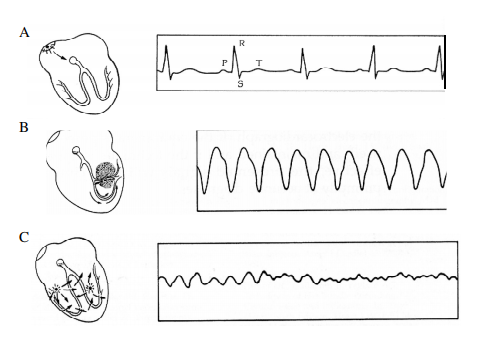 C – Fibrilação ventricular. Na figura observa-se a despolarização desordenada das células cardíacas que pode ser observada no traçado eletrocardiográfico pela inexistência de um ritmo regular. A Fibrilação é gerada na maioria das situações pelo mecanismo de reentrada ilustrado em B que degenera para um ritmo desorganizado.