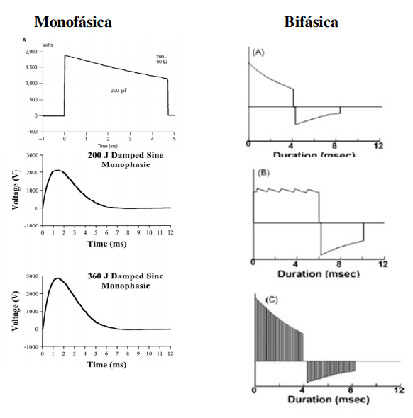 Alguns aparelhos mais antigos têm um padrão de onda dito monofásico, pois o gráfico de variação da energia desferida em função do tempo é positivo (Figura 3),que implica que os níveis de energia a serem desferidos sejam maiores.