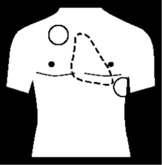 A fibrilação ventricular é um ritmo desorganizado, sendo impossível contração organizada do coração. Isso implica ausência de circulação e que o paciente evolua rapidamente (cerca de 10 segundos) para parada cardíaca após o seu início. No entanto, há outros DRC que podem originar a parada cardíaca, que não respondem à desfibrilação, sendo necessário monitorizar o paciente para o seu diagnóstico. Para evitar desperdício de tempo nesse processo, as pás do DCMP permitem a monitorização do ritmo ao serem colocadas no tórax, conforme ilustrado na Figura a seguir.
