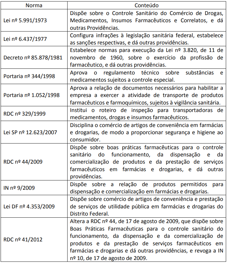 As RDCs n°s 44 / 2009 e 41 / 2012 atualizam e tornam mais claras as regras para o comércio de medicamentos e produtos em farmácias e drogarias, assim como para a prestação de serviços exercida por esses estabelecimentos. Estabelece os critérios e condições mínimas para o cumprimento das Boas Práticas Farmacêuticas para o controle sanitário do funcionamento, da dispensação e da comercialização de produtos e da prestação de serviços farmacêuticos em farmácias e drogarias. Estas resoluções aplicam-se às farmácias e drogarias em todo território nacional e, no que couber, às farmácias públicas, aos postos de medicamentos e às unidades volantes. Não se aplicam aos estabelecimentos de atendimento privativo de unidade hospitalar ou de qualquer outra equivalente de assistência médica que ficam sujeitos às disposições contidas em legislação específica.
