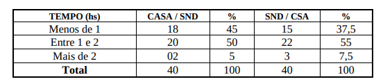 Quanto ao tempo de transporte, de acordo com uma amostra de 40 pessoas, a grande maioria dos funcionários, 50%, gasta entre uma e duas horas para deslocar-se de casa para o trabalho, contra 45% que gasta menos de uma hora e 5% mais de duas horas. No retorno do trabalho para casa, o número de trabalhadores que gasta menos de uma hora esta em torno 37,5%, e entre uma e duas horas, 55%, e o restante 7,5% gasta mais de duas horas. Estes dados estão resumidos na tabela abaixo.