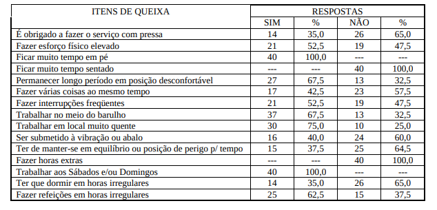 De acordo com a amostra entrevistada (n=40) dos trabalhadores do SND, a maior dificuldade enfrentada é o fato de se trabalhar o tempo todo na posição em pé, essa foi uma queixa de 100% dos entrevistados. A segunda reclamação se refere ao calor excessivo no ambiente de trabalho, 67,5% relataram a dificuldade de se trabalhar em ambiente ruidoso e o mesmo percentual considerou a postura desconfortável como um fator desgastante. Outro fator de descontentamento com o trabalho foi o fato de se ter que trabalhar sábados e/ou domingos, isso foi citado por 100% dos entrevistados. A tabela a seguir mostra esses dados. A linguagem utilizada foi na forma coloquial.
